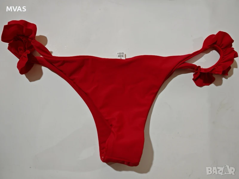 5)Червен бански долнище 10 лв, двоен приятен на допир плат, полуизрязан, декориран отстрани с волани нагънати като цветчета, еластичен.