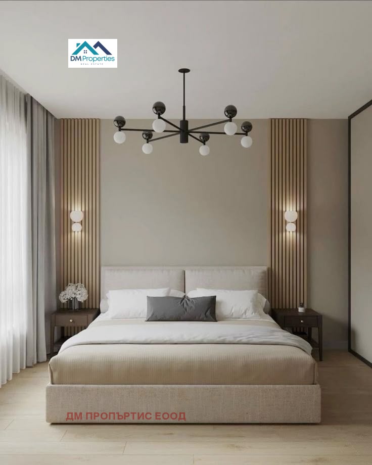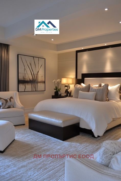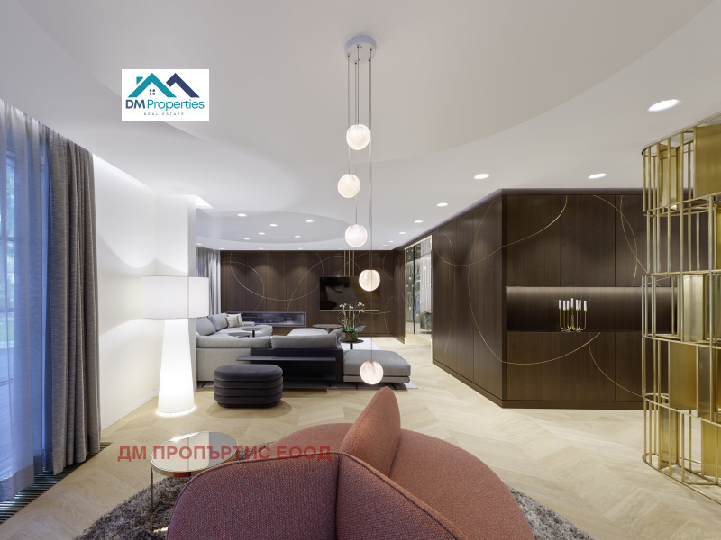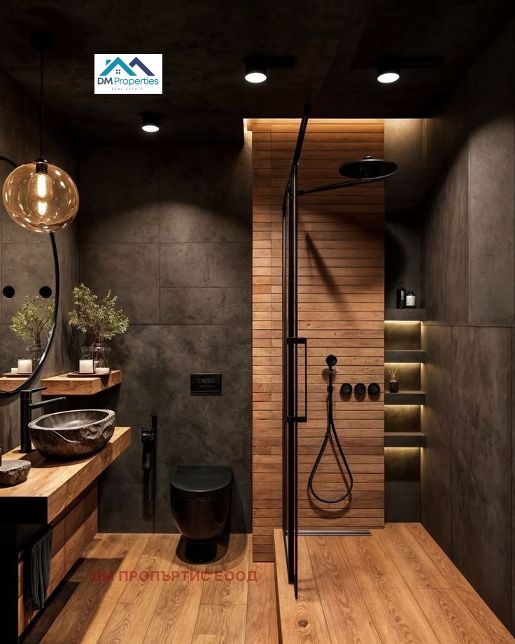 Настилки и стени - висококачествен полиран гранитогрес, окачени тавани със скрито LED осветление, стилни осветителни тела.