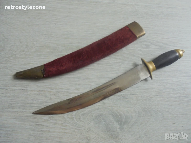 стар индийски нож с автентичен външен вид и ръчна изработка. Острието е с дължина 21 см, общата дължина – 30 см. Комплектът включва оригинална кания, облечена в червена кадифена материя с месингови елементи. Подходящ за колекционери, декорация или тематични подаръци.
