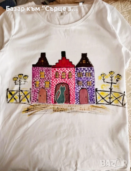 Снимка 11 Ръчно рисувана тениска Котка на покрива - 25 лв. Размер М (94 см гръдна обиколка; памук и еластанч вталена). Пране на 30 градуса, гладене от обратната страна