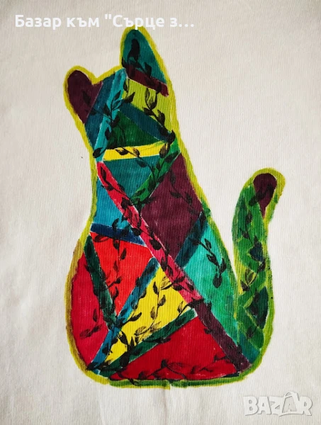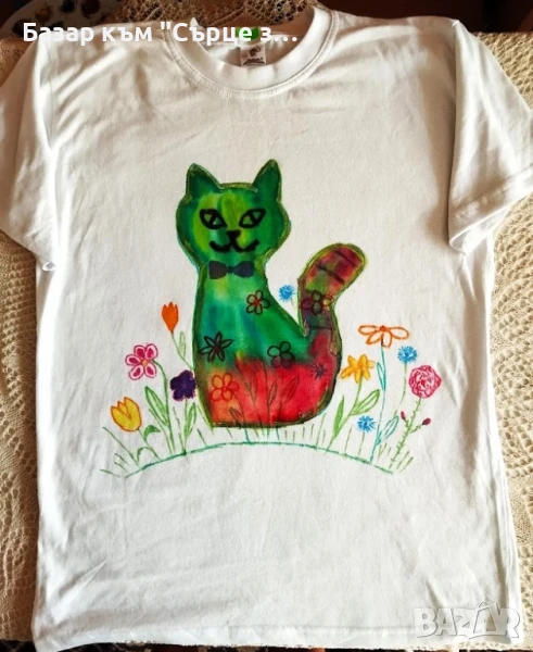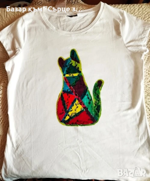 Снимка 2 Ръчно рисувана тениска Шарена котка - 20 лв. Размер L (100 см гръдна обиколка). Пране на 30 градуса, гладене от обратната страна