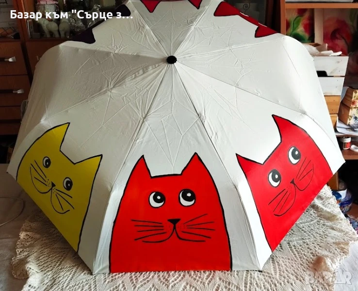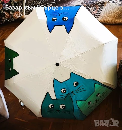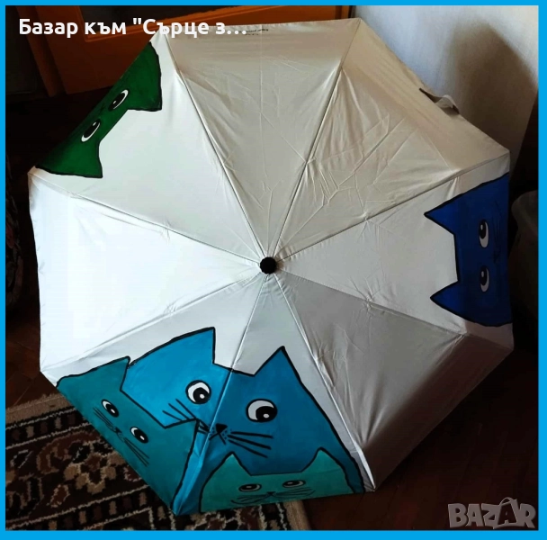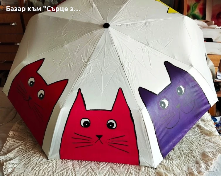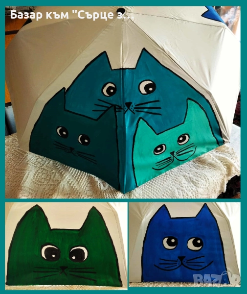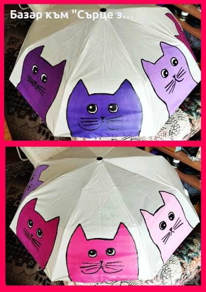 Пет рисувани котки, кацнали на един чадър, чакат своя стопанин 40 лв; 50 см; сгъваем с UV защита
