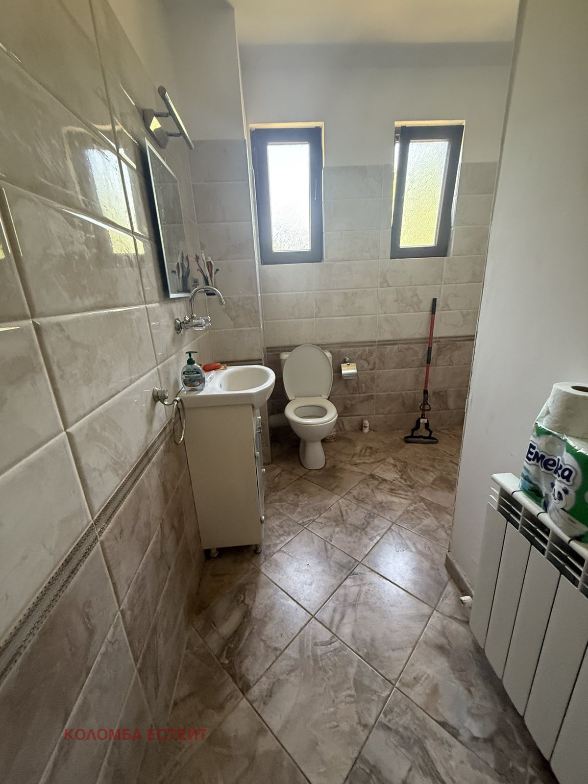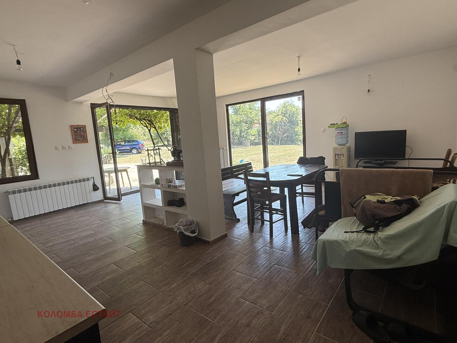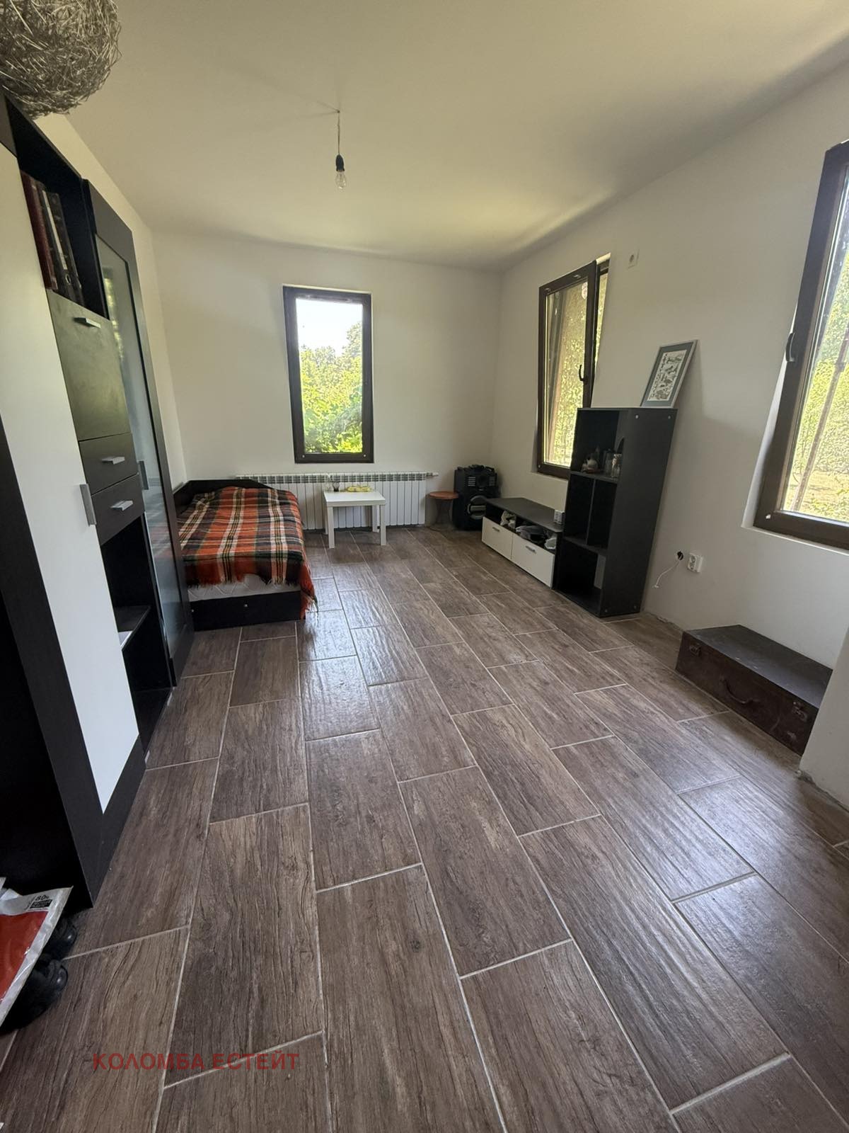 - Първи етаж: просторен хол с трапезария, отделна стая и завършена баня с тоалетна.
