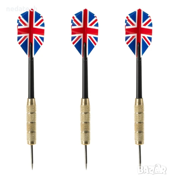 Пакетът съдържа 3 стрелички с американско или английско знаме и златна метална част. Съдържа пластмасови капачки за носа.
