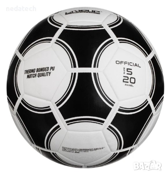 Футболна топка с официален размер №5, бяла с черни шарки. Технологията на производство гарантира много часове игра, задържане на въздух и закръгленост по време на употреба.