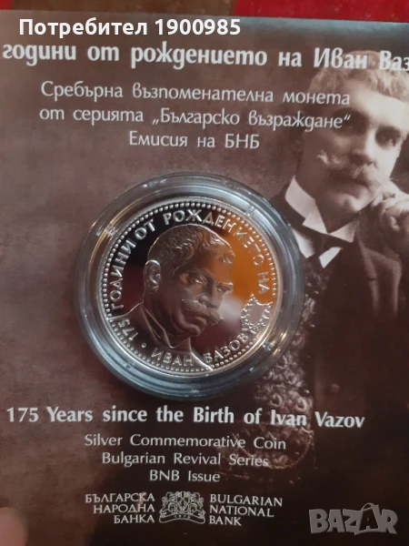 Сребърна монета 10 лева Иван Вазов 175 години от рождението → Обява 50959594