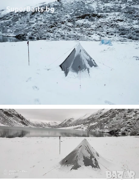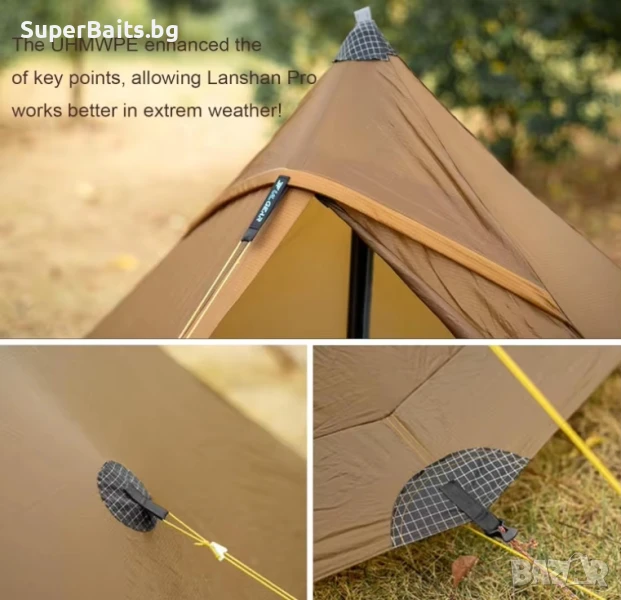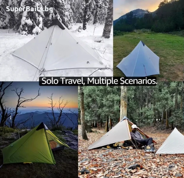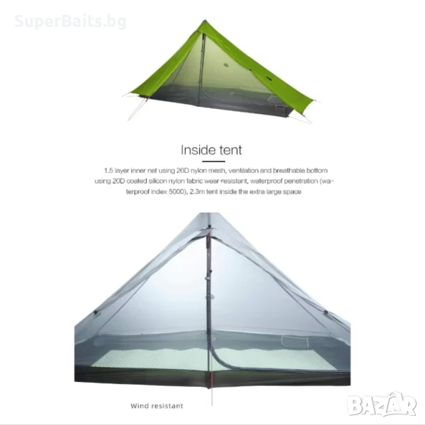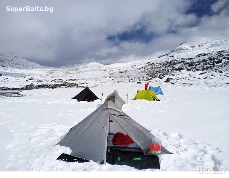 Ултра Лека Палатка 4 сезона, подходяща за преходи и къмпингуване на открито. Палатката е само 690гр (без рейките/щеките) и е 1.5 слойна, което ще рече че има отделена долна част - престилка от допълнително подсилена водоустойчива материя, в комбинация от мрежа за проветрение + предна стена, която отделя вътрешната част от преддверието.