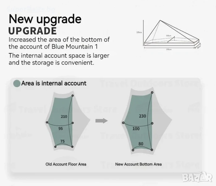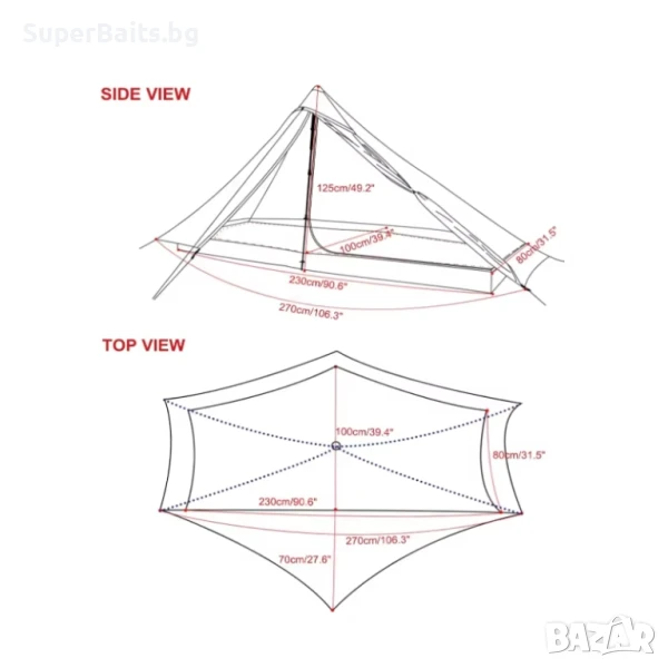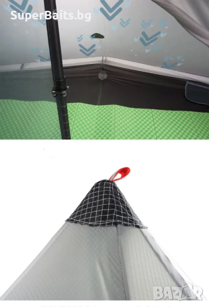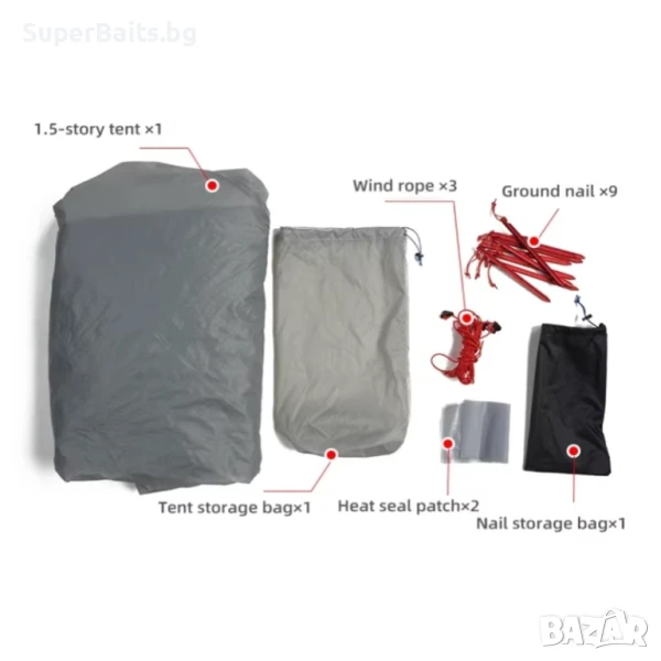 - комплектът включва палатка, въжета и метални колчета, за разпъването са необходими или рейки или трекинг щеки,