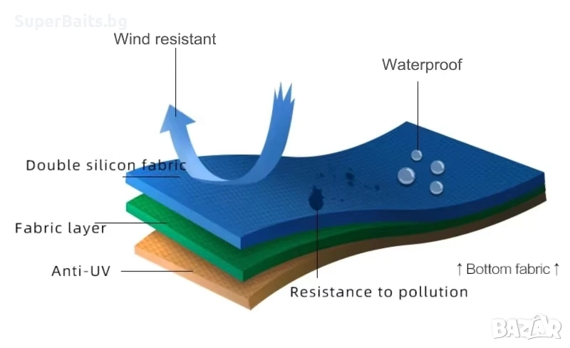 - изработена от здрава материя - 20D double silicon fabric за горната част (waterproof index 3000MM) + 20D nylon breathable gauze - здрава мрежа за предната стена и вентилиращите отвори и 20D silicone waterproof nylon (waterproof index 5000MM) за основата,