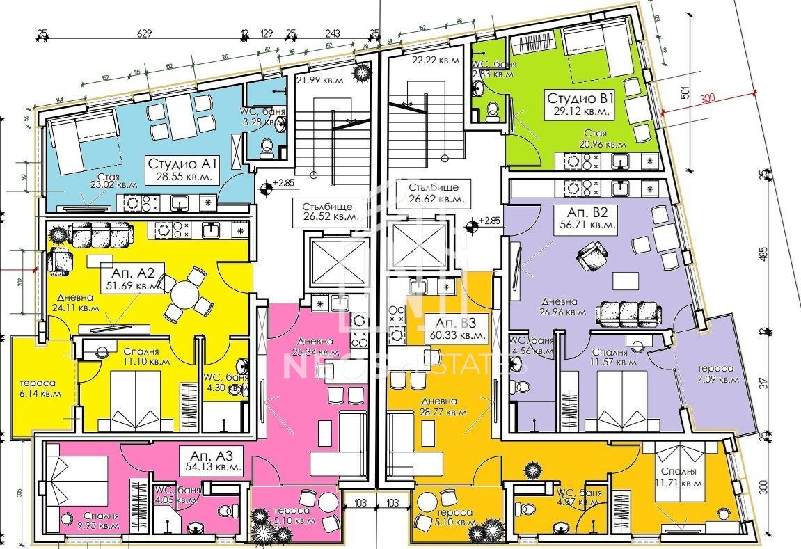 Студио В1, със западно изложение. Застроена площ 29.12 кв.м. плюс 6.74 кв.м. общи части.