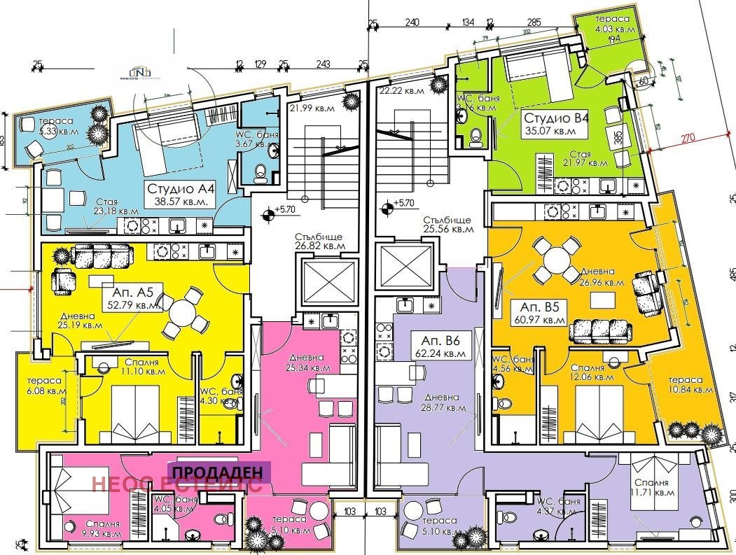 Студио B4, със западно изложение. Застроена площ 35.07 кв.м. плюс 9.08 кв.м. общи части. В цената е включено и паркомясто с площ 12.50 кв.м.