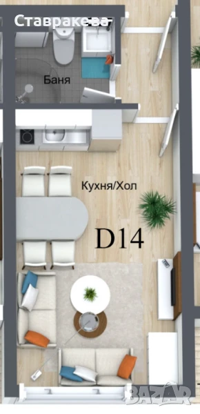 Директно от собственика. Едностаен апартамент D14 (блок D, ет 1) с обща площ 31,93 кв.м., с разпределение: антре, хол с кухня, баня с тоалетна. Цена: €28000 без ДДС (€33600 с ДДС).