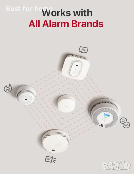 Универсална съвместимост: Работи с всички марки аларми, сертифицирани от UL, включително самостоятелни/безжични взаимосвързани/AC кабелни модели; съвместими със стандартни и гласови аларми, със или без местоположение