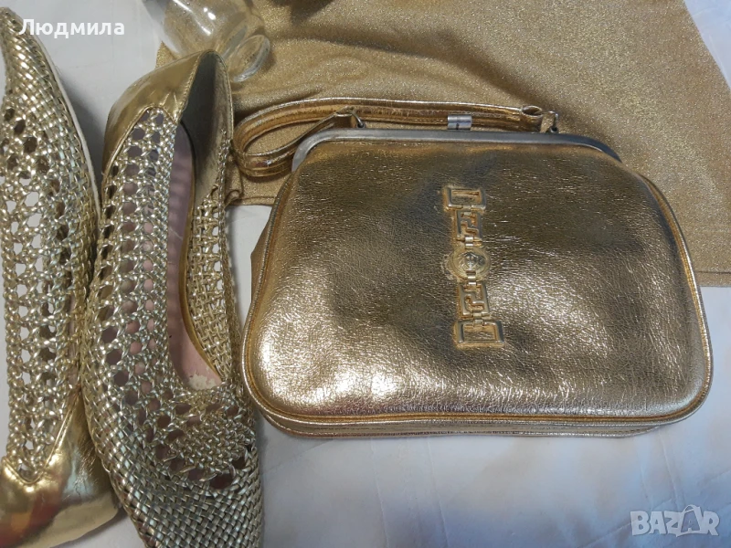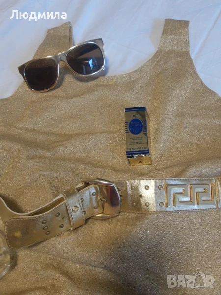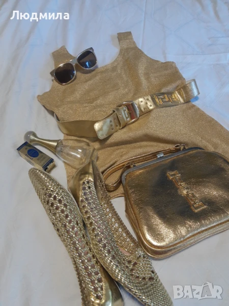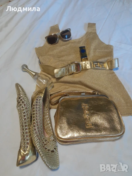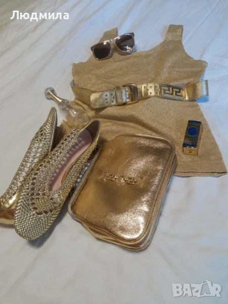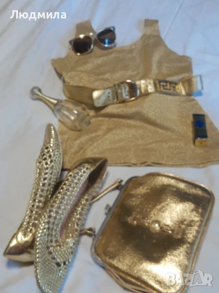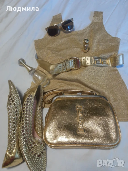 Продавам златен сет,потник,колан,чанта,очила ,обувки N:40.Другите аксесоари са за декорация.Чантата и колана са VERSACE.Лято е е заложете на злато,загар и още нещо.