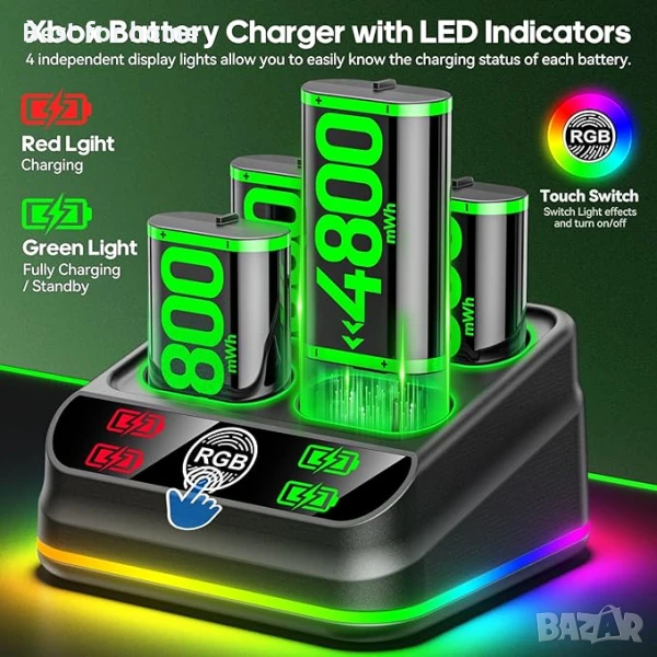 9 СВЕТЛИНИ С ПРЕВКЛЮЧВАТЕЛЯ С ДОСЪРКВАНЕ: Зарядното устройство за батерии Xbox разполага с амбиентно осветление отдолу. Станцията за зарядно устройство за батерии Xbox има превключвател за осветление. С кратко натискане превключвате между 9 различни режима на осветление, включително 7 едноцветни режима и режими на бързо и бавно „дишане“ на цветовете. С продължително натискане изключвате светлината. Този комплект батерии и зарядно устройство за Xbox могат да създават богати цветове и страхотни игрови сцени, което ви дава зашеметяващо визуално усещане и усещане при употреба.