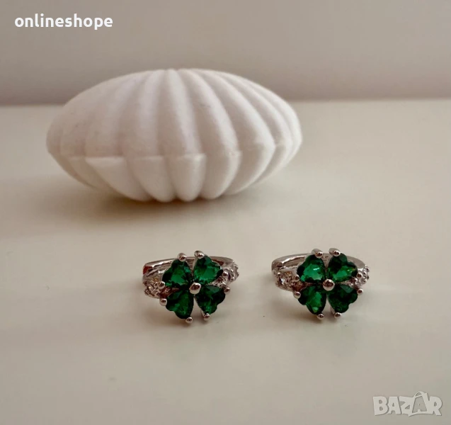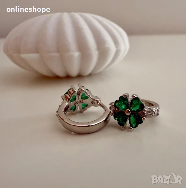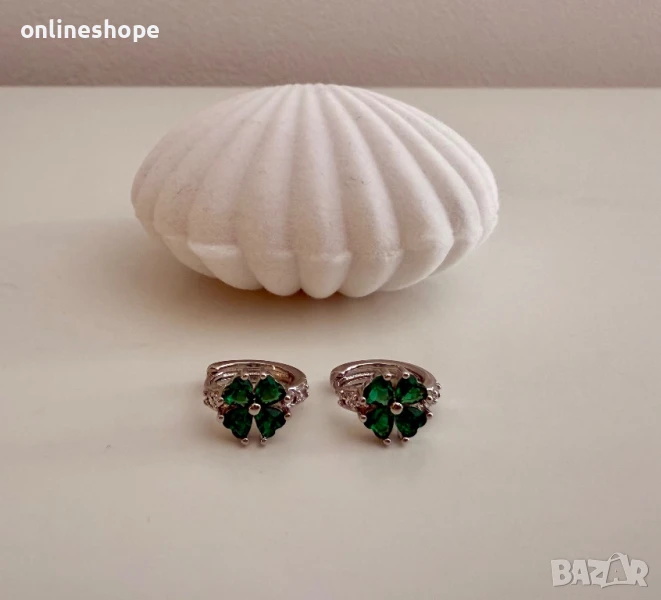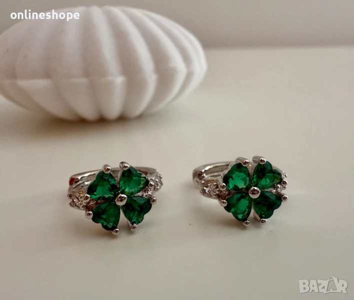 S925 Сребърни обеци с камък ( зелен цирконий ) детелина