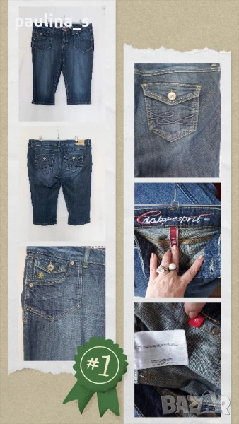 1️⃣. Колаж / L / 2XL - "EDC by Esprit Five". Цената е крайна 39,99лв / 20 евро. ВИНТИДЖ 2002 г / Дънкови бермуди с ниска талия, модел 5 pocket Denim, отзад джобовете са с капаци, брандирани копче и кабси, бродирано лого, кожена емблема. Платът е без еластичност, стоят много добре, отговарят на номера. Качеството на изработката е перфектно. Без дефекти, като нови.