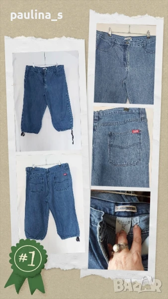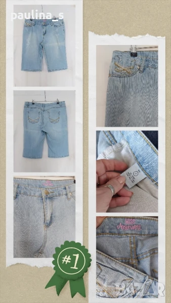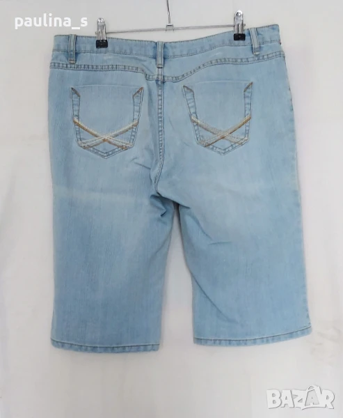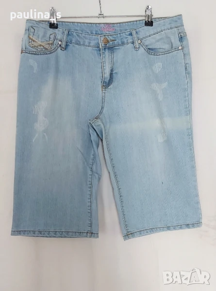 3️⃣. Колаж / XL / 3XL - "Miss Janiest". Цената е крайна 19,99лв / 10 евро. Дамски еластични дънкови бермуди. Платът е летен, релефен дънков и доста еластичен. Моделът е "5 pocket Denim", нормална талия. Имат накъсан и избелващ ефекти, добре се виждат орнаментите на снимките. Без дефекти и етикет, като нови.