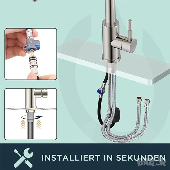 Лесен за самостоятелно инсталиране благодарение на гъвкави маркучи и бързи връзки. Инсталирайте го сами за секунди без професионален водопроводчик.Кухненският смесител FORIOUS е изработен от здрави материали с метална конструкция за дълготрайна издръжливост. Чучурът с висока дъга се завърта на 360° за широк обхват на движение в и около мивката, осигурявайки достатъчна височина за пълнене и почистване на най-големите ви тенджери и най-високи кани. Дръжката за една ръка осигурява познато ръчно управление, което ви позволява лесно да регулирате температурата и водния поток.