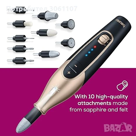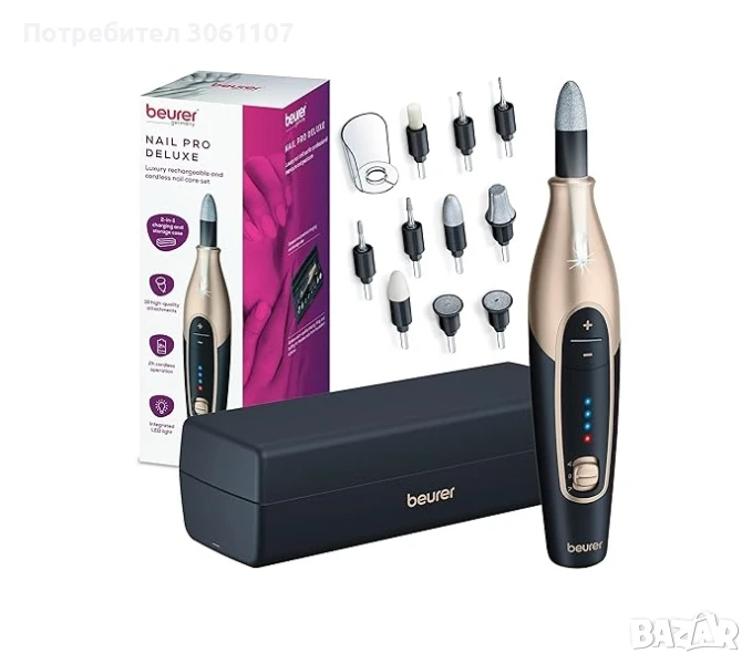 Не ходете в салон за маникюр, а си направете такъв у дома. Основното нещо, от което се нуждаете, е комплектът за перфектен маникюр BEURER MP 84. Той включва мощна мини фреза и 10 приставки, с които можете да оформите ноктите на ръцете и краката като професионалист. Много е удобен за хващане, така че да се работи с него е удоволствие. С едно зареждане издържа до 2 часа работа, без да се налага да го свързвате към електричество. Благодарение на калъфа за пътуване, можете да го вземете и по време на пътуване.