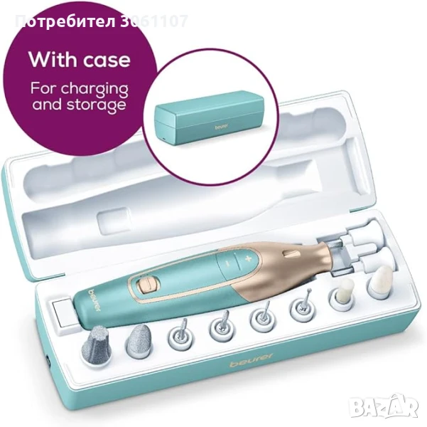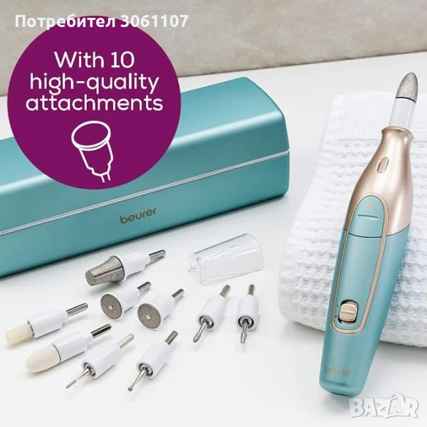 Не ходете в салон за маникюр, а си направете такъв у дома. Основното нещо, от което се нуждаете, е комплектът за перфектен маникюр BEURER MP 84. Той включва мощна мини фреза и 10 приставки, с които можете да оформите ноктите на ръцете и краката като професионалист. Много е удобен за хващане, така че да се работи с него е удоволствие. С едно зареждане издържа до 2 часа работа, без да се налага да го свързвате към електричество. Благодарение на калъфа за пътуване, можете да го вземете и по време на пътуване.