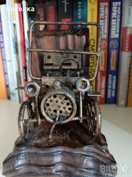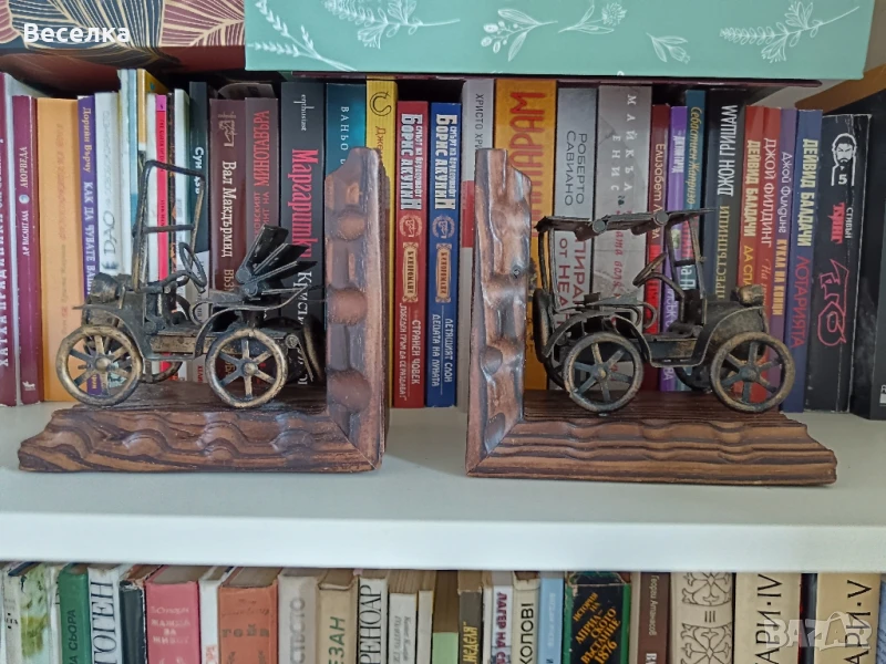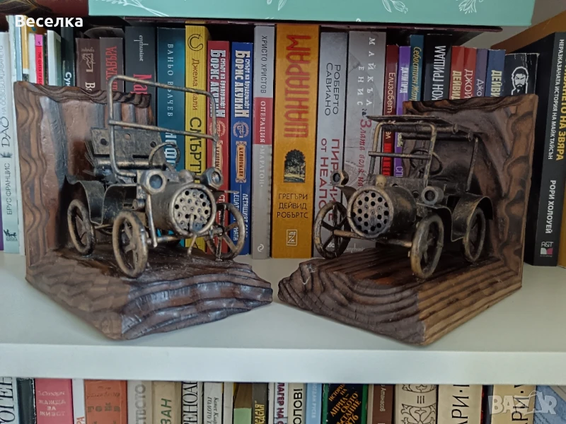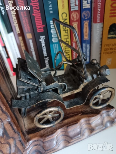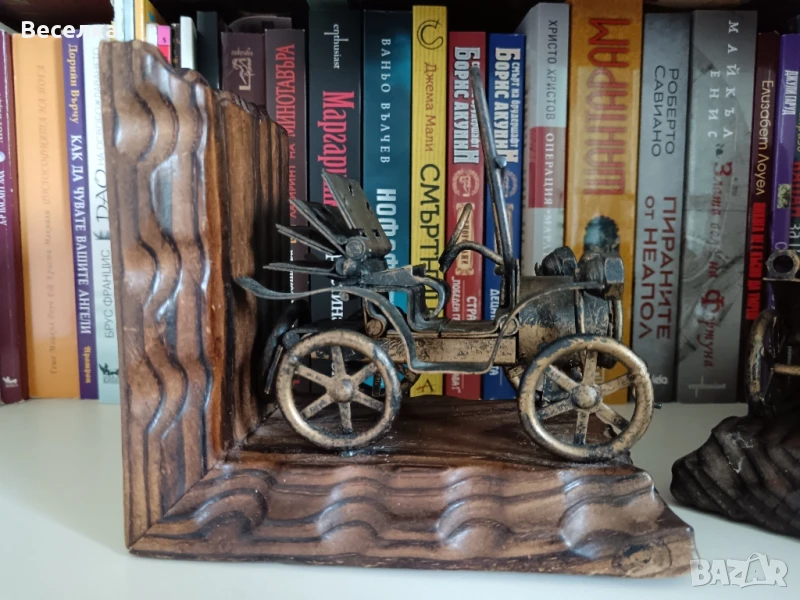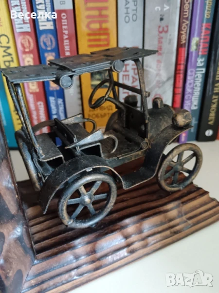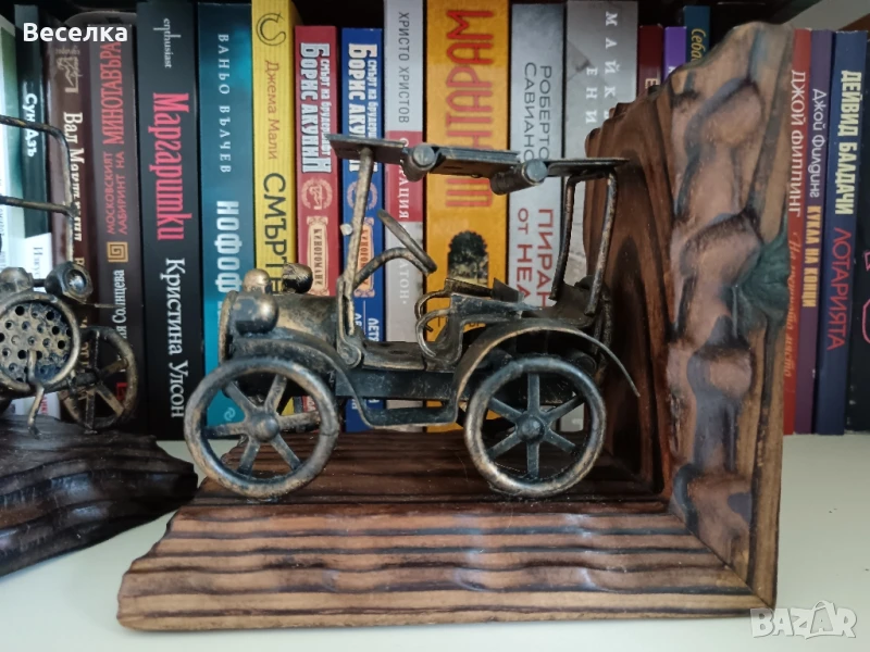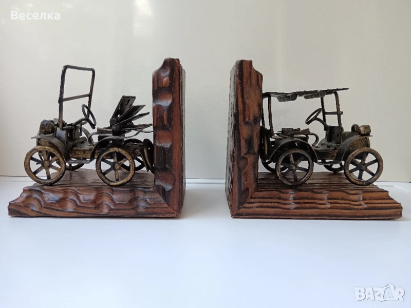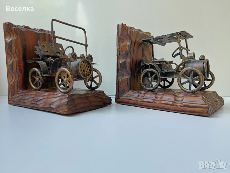 Комплект стопери /подпорни тежести/ за книги с ретро автомобили. Ръчно изработени от дърво и метал. Много детайлни и красиви. Нямат забележки. Стикер маркировка за произход Испания. Цена 100 лв.