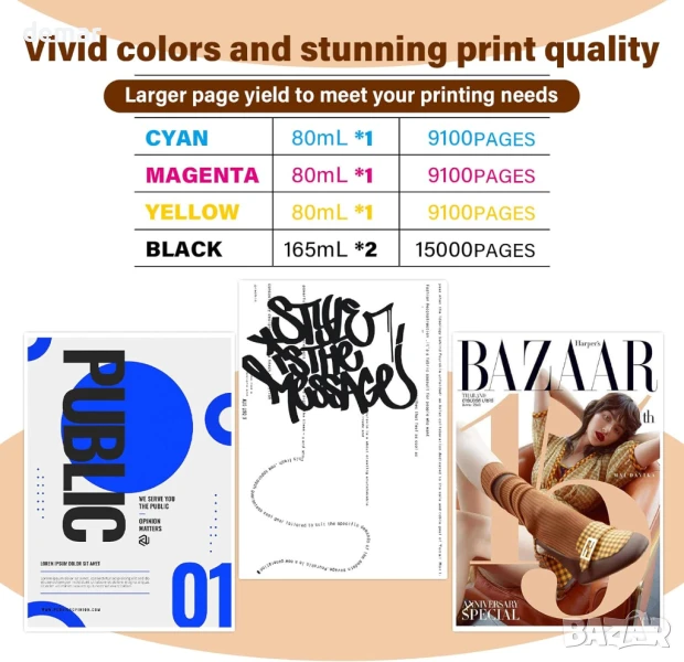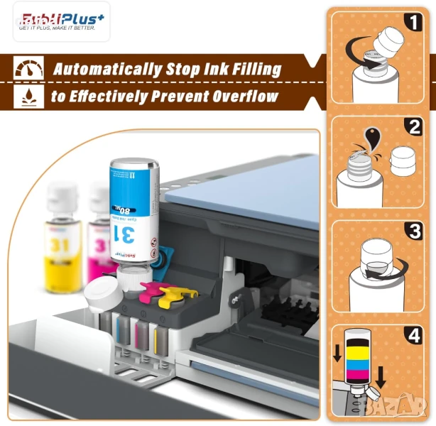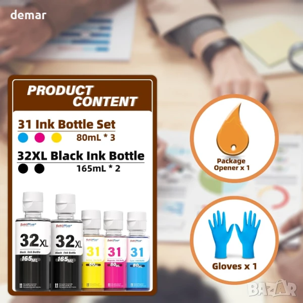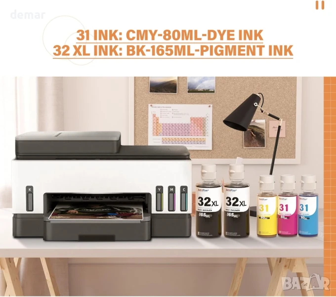 Съвместим със сериите HP Smart Tank и Smart Tank Plus, този комплект за пълнене на мастило включва две черни бутилки 165ML 32XL (на пигментна основа) и три цветни бутилки 80ML 31 (на багрилна основа) с общ капацитет до 15 000 страници. Дизайнът е с автоматичен механизъм за спиране, за да се предотврати преливане и запушвания по време на пълнене. Комплектът включва също ръкавици и инструмент за отваряне на капачката. Смесването на черни и цветни мастила не се препоръчва поради различните видове мастила.