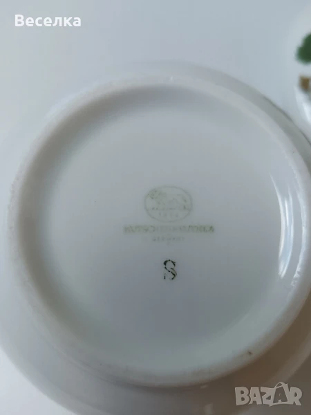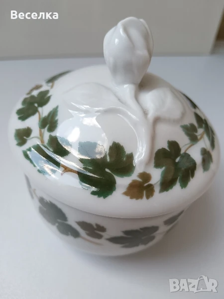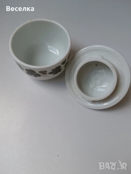 Захарница Hutschenreuther с декор "Лозови листа". Капак с релефна роза. Всичко е здраво. Капака не е оригинален и е от чайник на същата марка, затова не прилепва плътно, но си пасват цветово. Цена 20 лв.