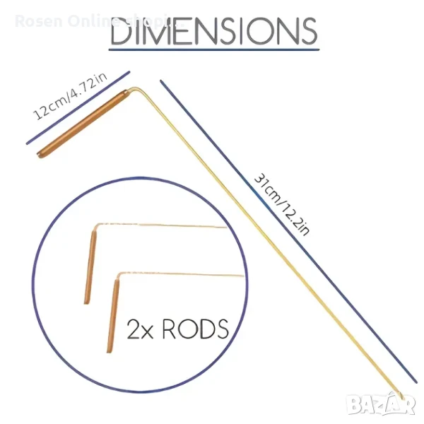 Качествени медни позлатени багети от чиста мед 99.99% с позлата за откриване на подземни води, ценни метали, съкровища,геоложки разломи,пещери,кухини и др. Цената за комплект 2 броя е 25 евро