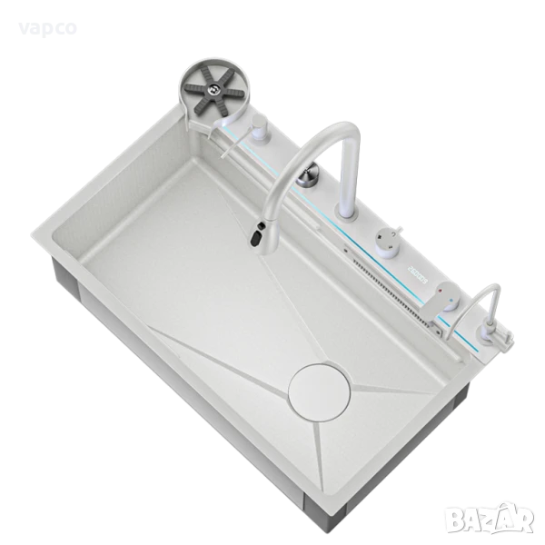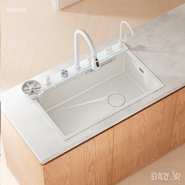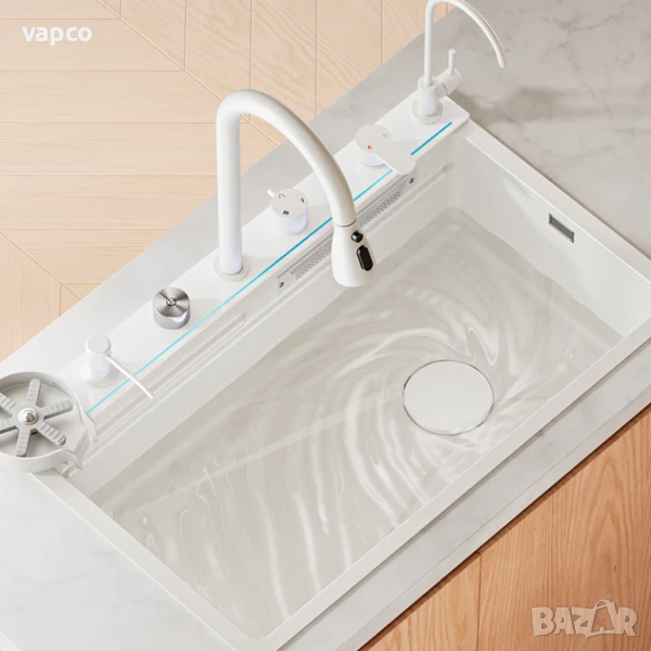 Висококачествена мултифункционална мивка от неръждаема стомана. Създава многофункционално работно пространство, за да можете удобно да миете плодове и зеленчуци с нейния