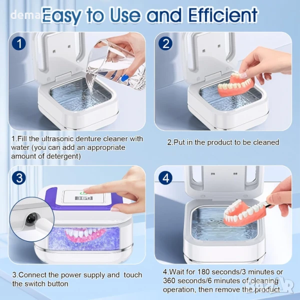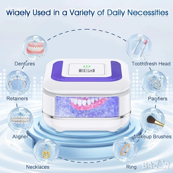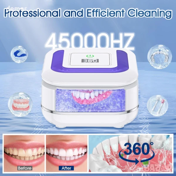 Тази подобрена ултразвукова почистваща машина използва 45kHz вълни за цялостно 360° почистване на зъбни изделия и бижута, като помага за премахването на до 99,99% от бактериите и миризмите, когато се използва с почистващи таблетки. Тя минимизира износването на ретейнери и подобни предмети, удължавайки живота им. Лесното управление с един бутон предлага режими на ежедневно и дълбоко почистване с ясен LED дисплей с таймер. Компактна и преносима, тя е идеална за домашна употреба или при пътуване и е практичен подарък.