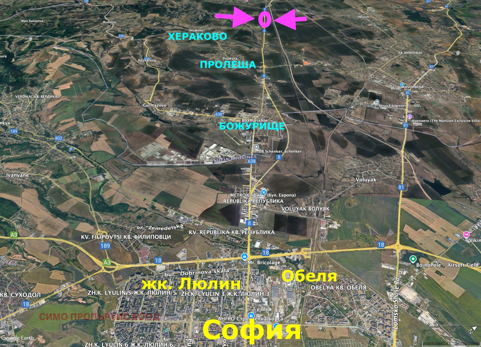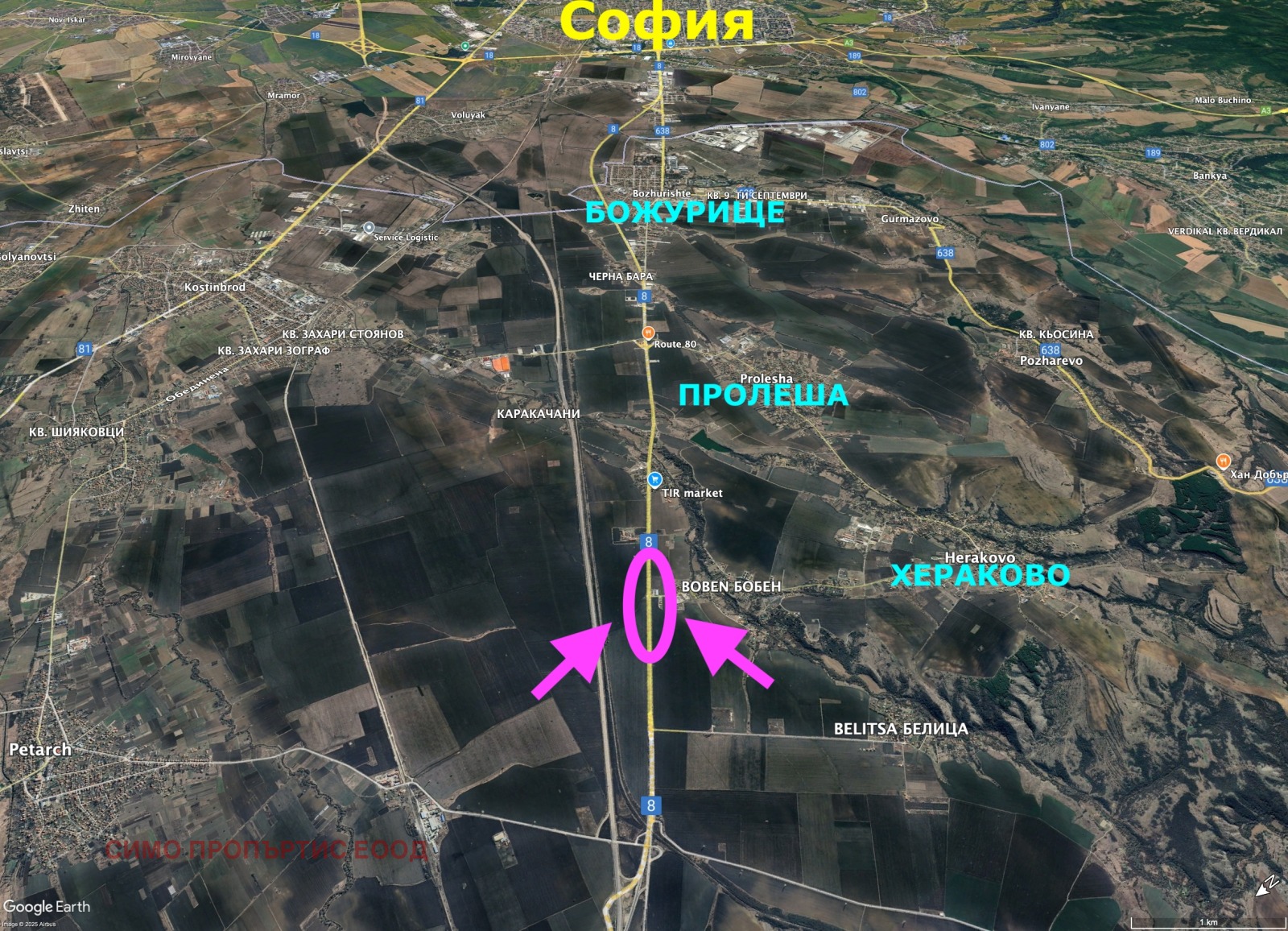ВСИЧКИ ОТ ИМОТИТЕ се намират с ГОЛЯМО ЛИЦЕ на международния път Е80 (бул. Европейски път продължението на бул. Сливница) посока Калотина (Сърбия - Западна Европа). Намират се в района на с. Хераково - община Божурище, на разстояние около 12 км. от София в западна посока.