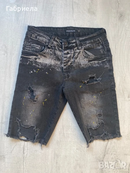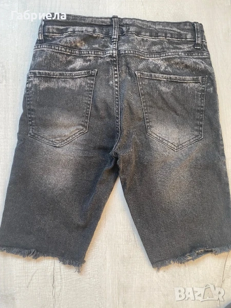 Къси дънкови панталони, размер 30 по етикет. Измерени от мен с дължина 50см, талия измерена в закопчано състояние в едната посока 37см, имат еластичност. Тениската е на FSBN, размер С, дължина 65см, подмишници 48см. Цената е обща.