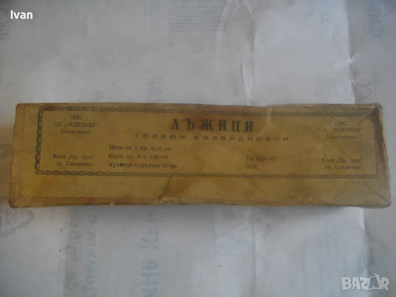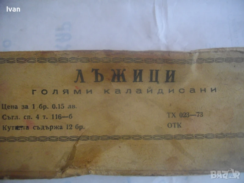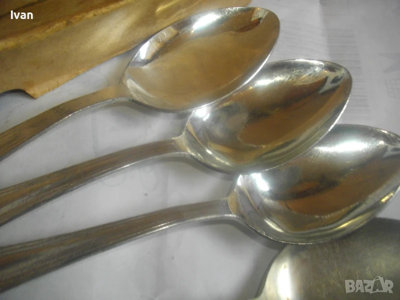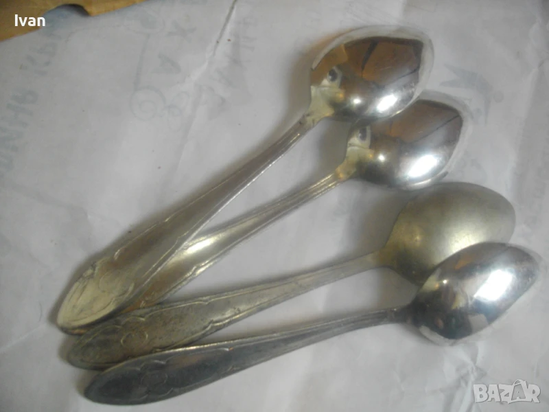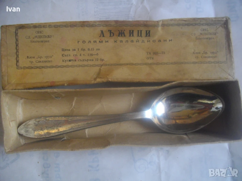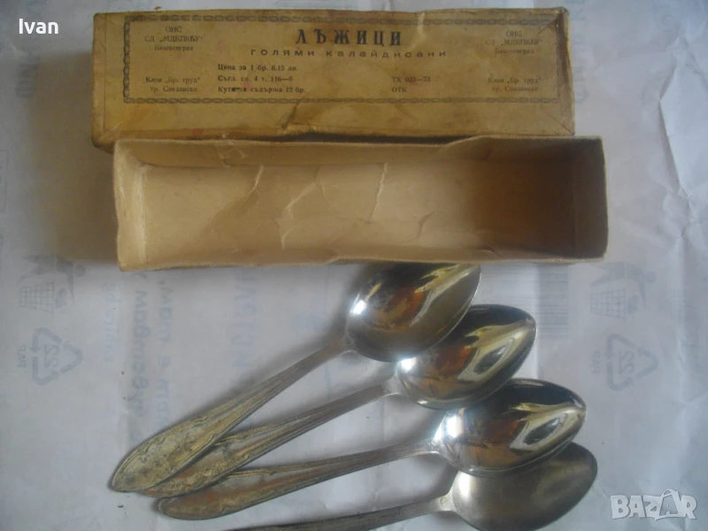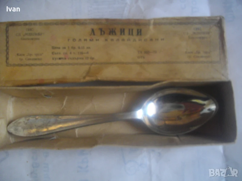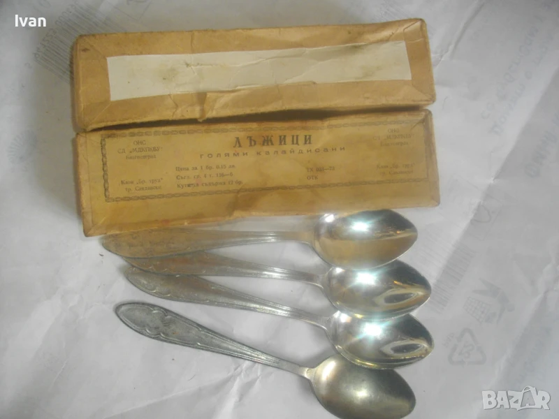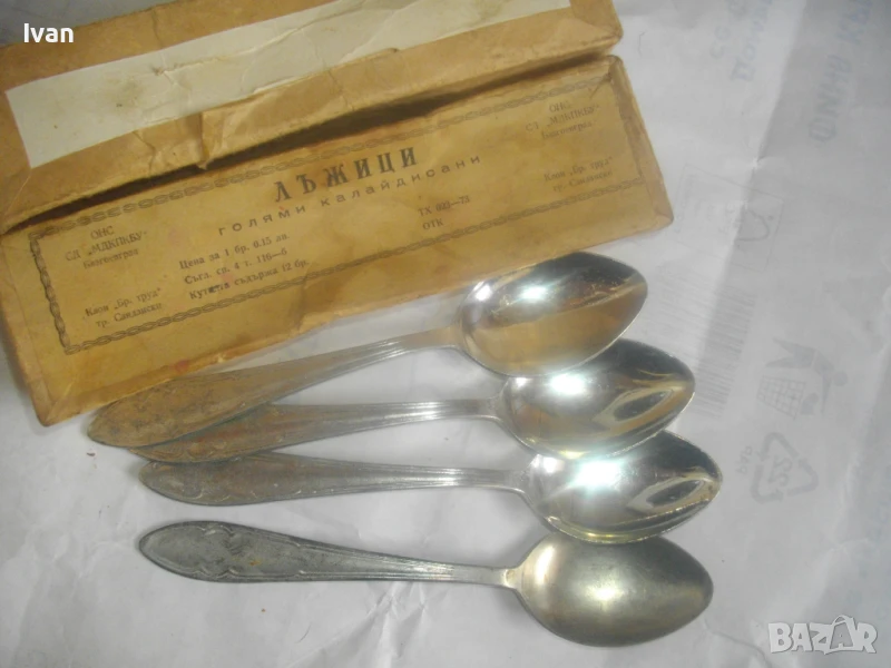 Продавам 4 броя нови български лъжици от Соц времето. Цена на 4-те броя 59 лв. В оригиналната си картонена кутия, с фабричен етикет, който е напълно запазен. Вписвания по етикета: