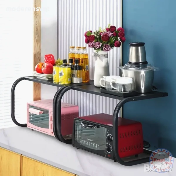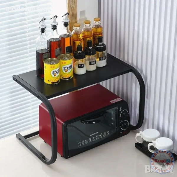 Ако ви липсва място в кухнята, тази етажерка ще ви помогне да го оптимизирате ефективно. Поставена над микровълновата, тя създава втори рафт за организация, като същевременно не пречи на използването на уреда. Подходяща е за малки и функционални пространства.