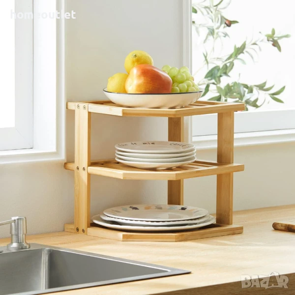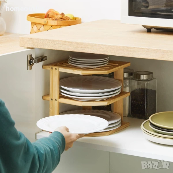Този свободностоящ ъглов рафт може да бъде поставен в кухненски шкаф или директно на плота, което ви позволява да организирате кухненския безпорядък и да осигурите място за съхранение.