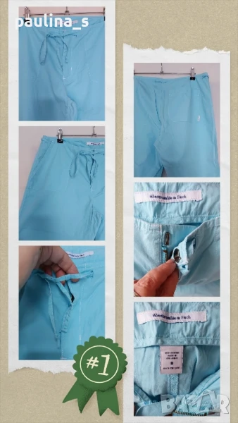 1️⃣ Колаж / M / XL - "Abercrombie and Fitch". Цената е крайна 19,99лв / 10 евро. Vintage! Като нови. / Дамски бермуди, талията е нормална и се регулира с шнур, бели маркиращи тегели, извивки на крачолите в страни, джобове. Материята 100% органичен памук, леко радиално еластичен. Без дефекти, като нови.