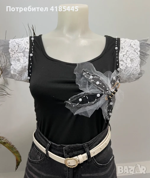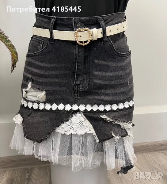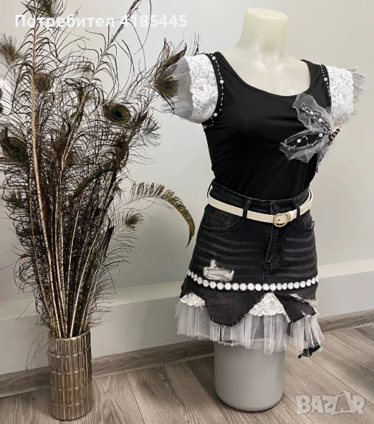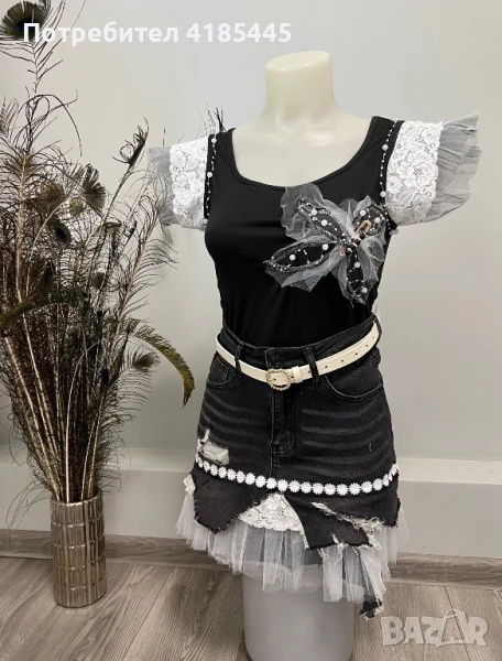 Дамски летен комплект, състоящ се от пола и блузка, в черно-бял цвят, моделиран и изработен от ARLEN 2000. Състав- деним, памук/полиестер и тюл.