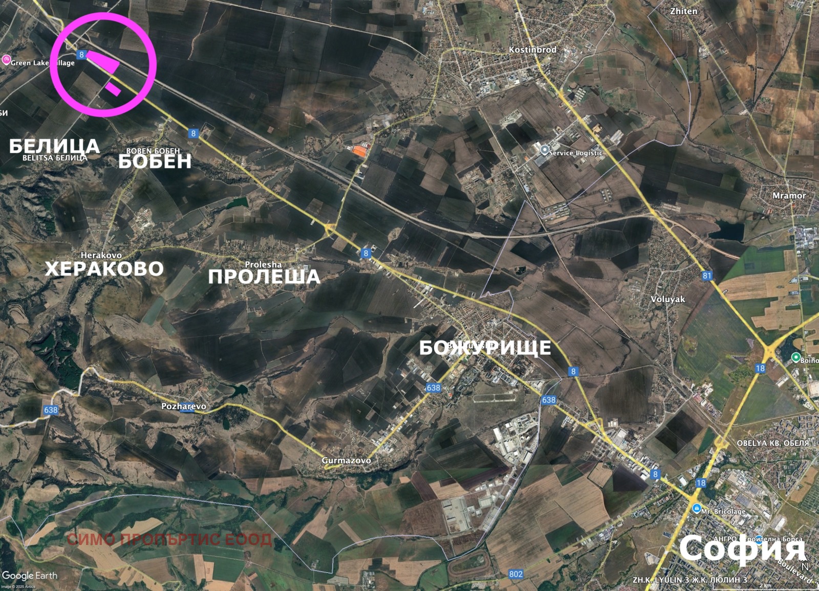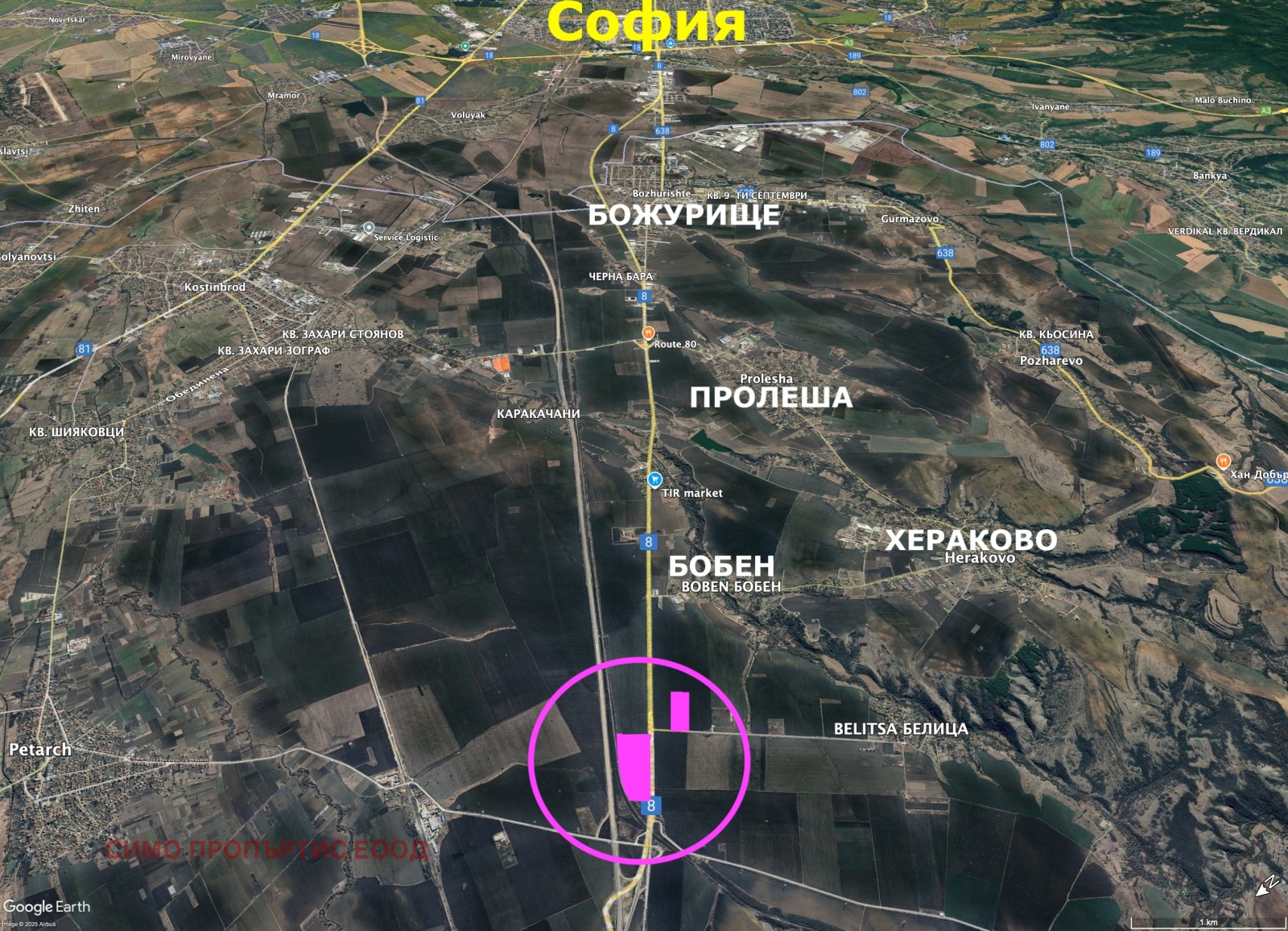 ВСИЧКИ ОТ ИМОТИТЕ се намират с ГОЛЯМО ЛИЦЕ на международния път Е80 (бул. Европейски път продължението на бул. Сливница) посока Калотина (Сърбия - Западна Европа). ЕДИН от имотите се намира С ЛИЦЕ на АСФАЛТОВ път за Бобен. Всички имоти се намират се в района на с.