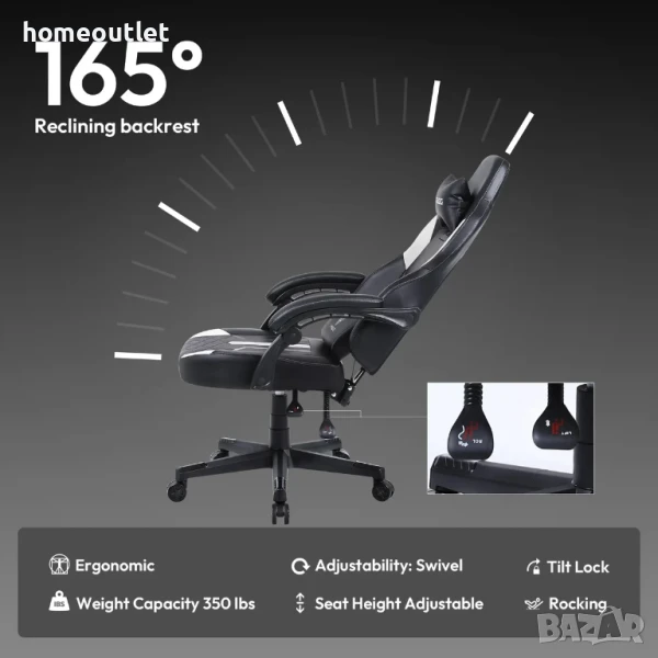 Облегалката се накланя от 90° до 135° и включва поставка за крака, което го прави чудесен за игри, работа или дрямка.