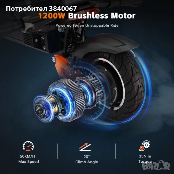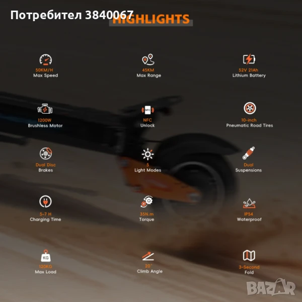 45–50 км/ч (действителната скорост може да варира в зависимост от теглото на ездача, терена, наклона и факторите на околната среда.)