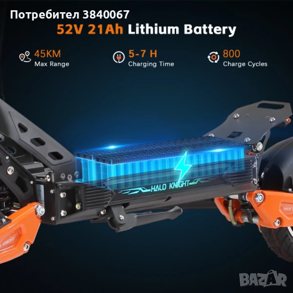 45 км (Действителният обхват може да варира в зависимост от теглото на ездача, терена, наклона и факторите на околната среда.)