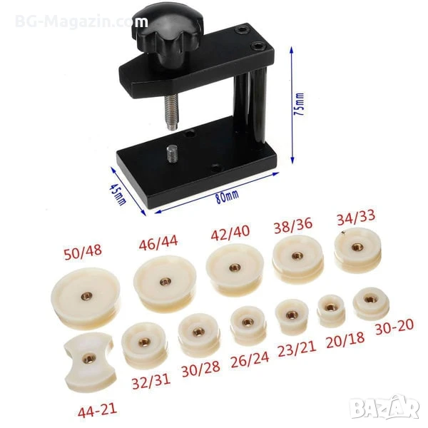 – Разнообразие от матрици: 12-те матрици с различни размери (от 18мм до 50мм) осигуряват съвместимост с широк спектър от часовници, позволявайки ви да затваряте капаци на различни модели и размери.