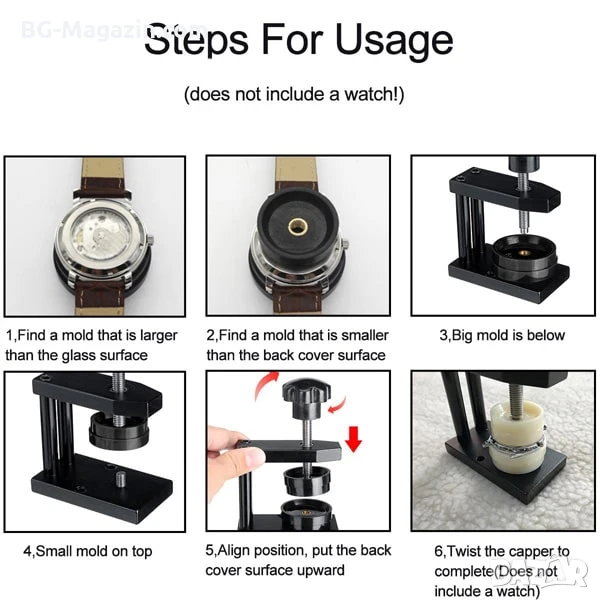 – Смяна на батерии: Пресата е идеална за затваряне на капаци след смяна на батерии на часовници.