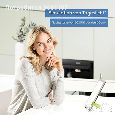 Лампа за дневна светлина с интензитет на светлината 10 000 lux (на разстояние приблизително 10 cm) за симулация на дневна светлина в случай на дефицит на светлина. Лампата с изкуствена дневна светлина помага срещу дисбаланс, депресивно настроение, енергия и осигурява положителна промяна в настроението.