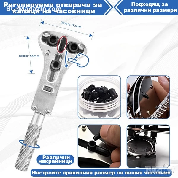 – Регулируем ключ за отваряне на заден капак: Позволява лесно отваряне на задния капак на часовници с различни размери.