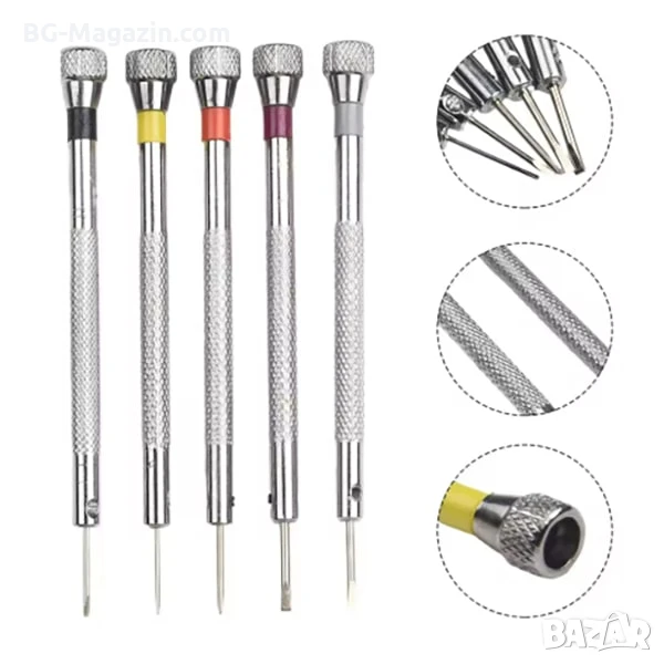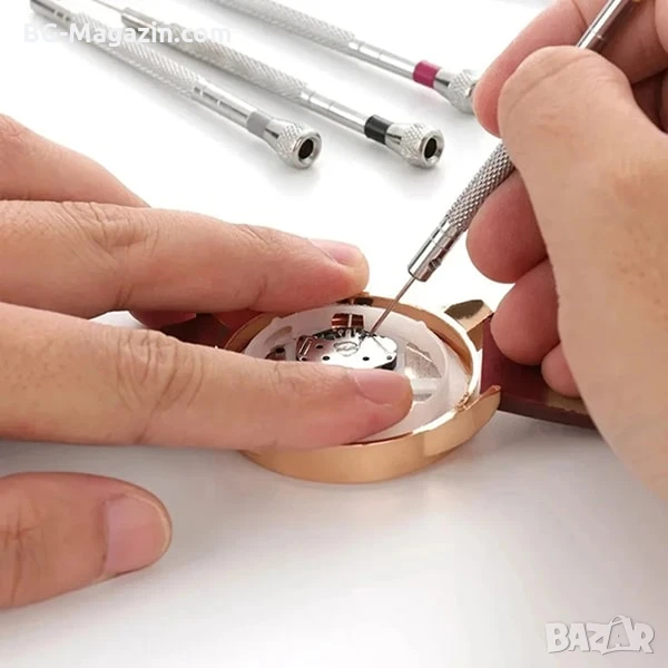 – Смяна на батерии: Отвиване и завиване на малки винтове при смяна на батерии на часовници.