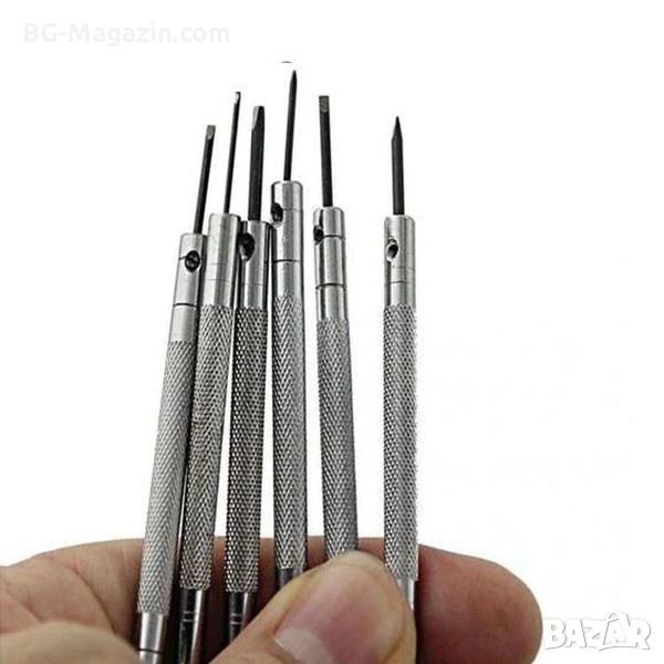 Представяме ви професионални часовникарски финни отвертки – незаменим инструмент за всеки часовникар, колекционер на часовници или човек, който иска сам да се грижи за своята колекция от часовници. Този комплект от 6 прецизни отвертки е специално разработен за работа с малки винтове, използвани в часовници, бижута и други фини механизми.