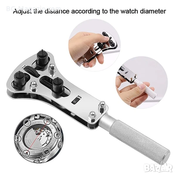 – Регулируемост: Инструментът разполага с регулируемо разстояние между накрайниците, което позволява работа с часовници с различни размери и видове капаци.