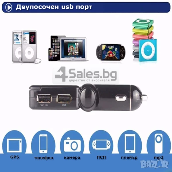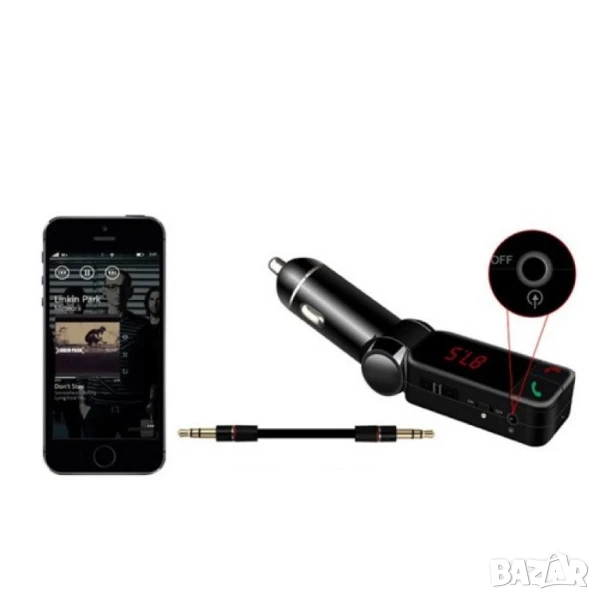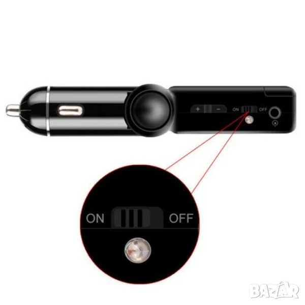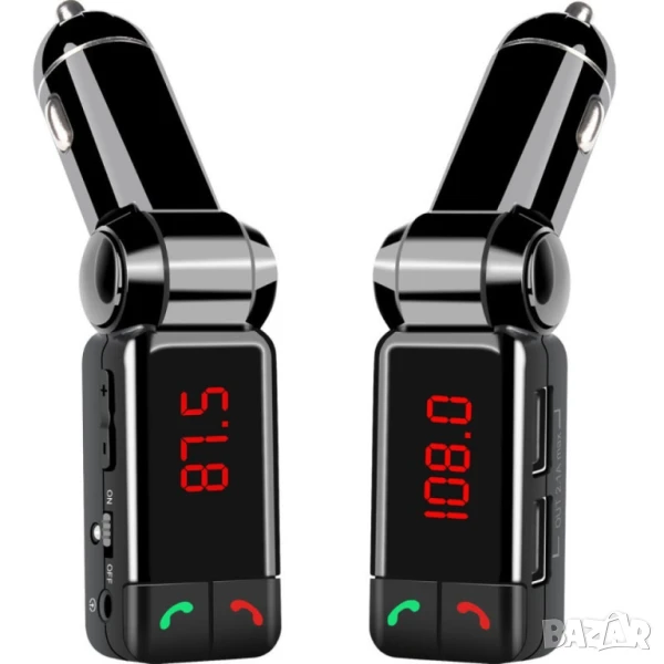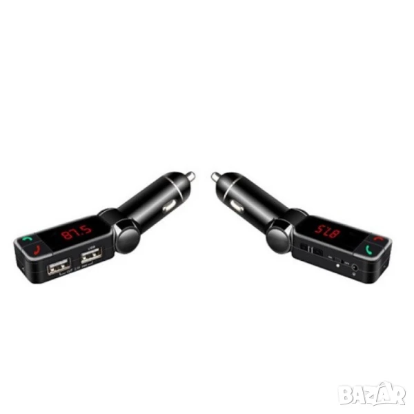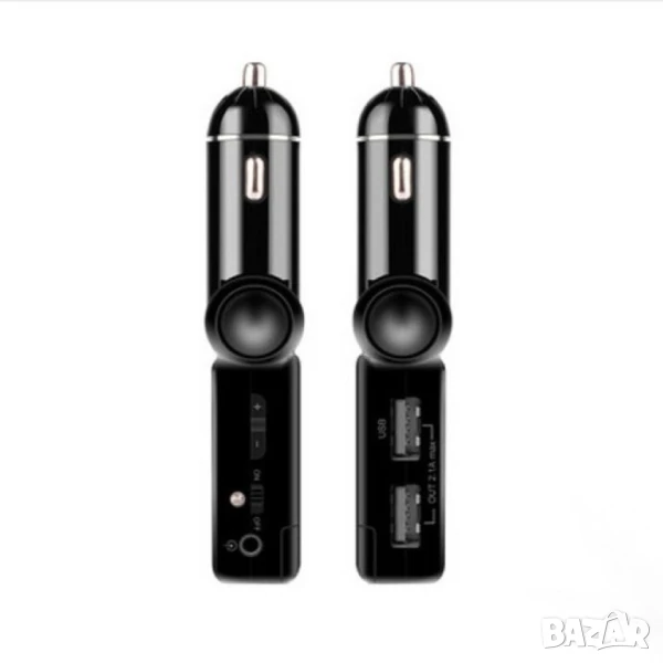 Блутут за кола (MP3player FM предавател зарядно USB и Bluetooth) / Материал на корпуса: метал, ABS Размери и тегло: 115/25/18 милиметра, 58 грама Специални функции: предавател за FM; MP3 player; USB; Bluetooth, запалка за кола / Съвместима марка коли: всички марки, универсално Външно напрежение: 12V/2A Изход за USB: 5V/2,1A Формат на файловете: MP3; SNR-60dB Честота на предаването: 20Hz – 15KHz Модел FM честота: дигитално стерео PPL, 87,5-108MHz Параметри Bluetooth: 2,1EDR, A2DP аудио предаване, дистанция 10 метра (до 2 метра за микрофона)